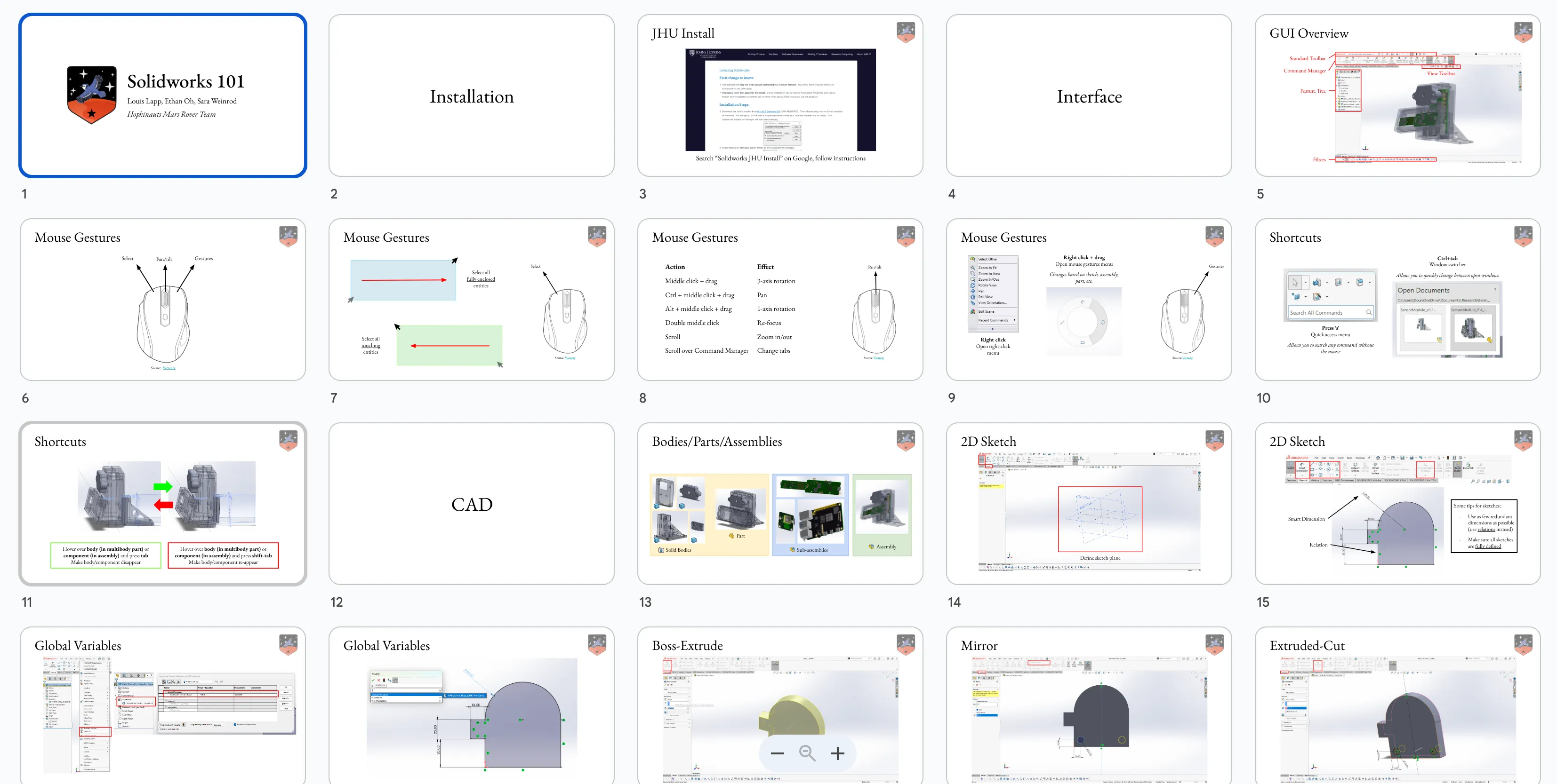 That’s why I, and many of my colleagues on the Mars Rover Team at JHU, pushed for workshops to teach incoming team members skills they need to get started on projects right away. To start, we held a Solidworks workshop for both new and former team members who had interest in CAD projects. The slides can be found here.