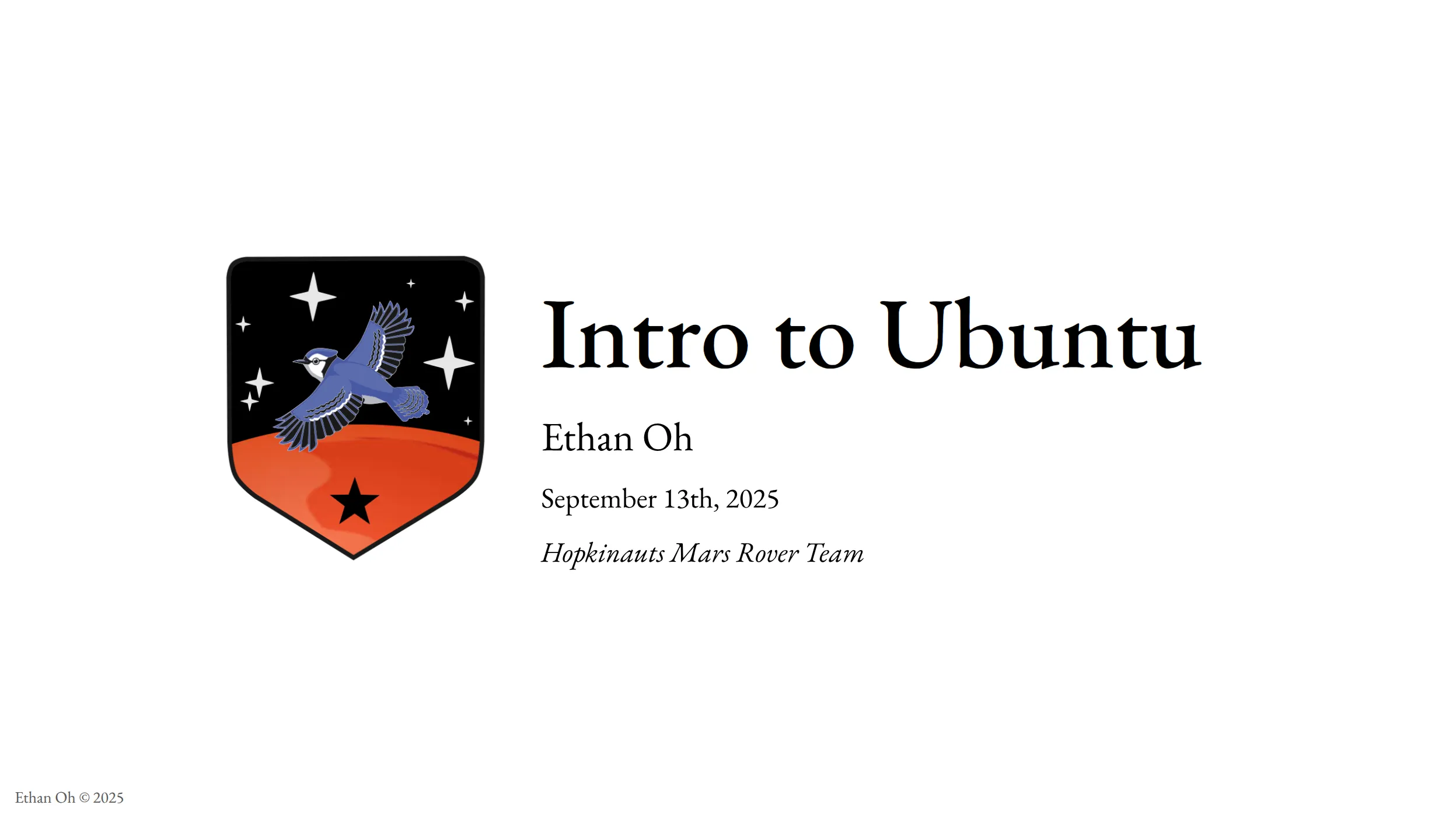 A continuation of the JHU Mars Rover Team’s new workshop series, I led the “Intro to Ubuntu” workshop to get the software team started with a Linux environment. The lecture focuses on setting up a virtual machine with Ubuntu 22.04 with the intention of using it for ROS2 development. I also dip into basic bash/CLI. I later met with team members interested in dual booting Ubuntu one-on-one to help troubleshoot any problems that came up. The slides can be found here.